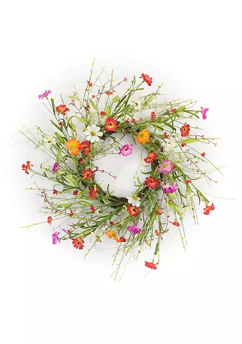This delightful wreath of mixed flowers is lovely and perfect to hang on your front door. It will give a warm welcome to the guest and it will add appeal to any decor. It features a small colorful flower with green leaves like grass.
